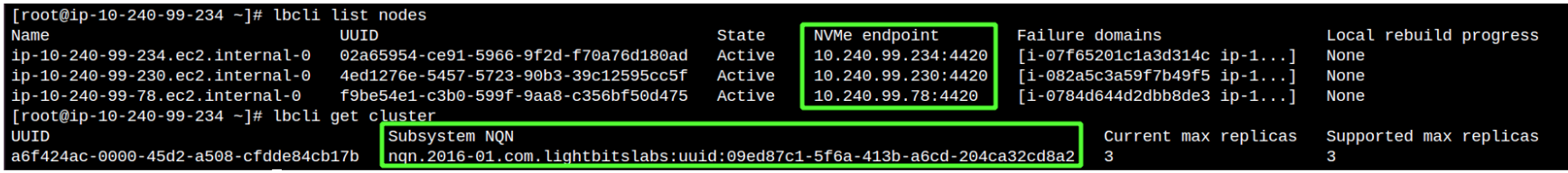 Gather the cluster NQN and IPs for reaching the NVMe/TCP connection between Lightbits and the client node.