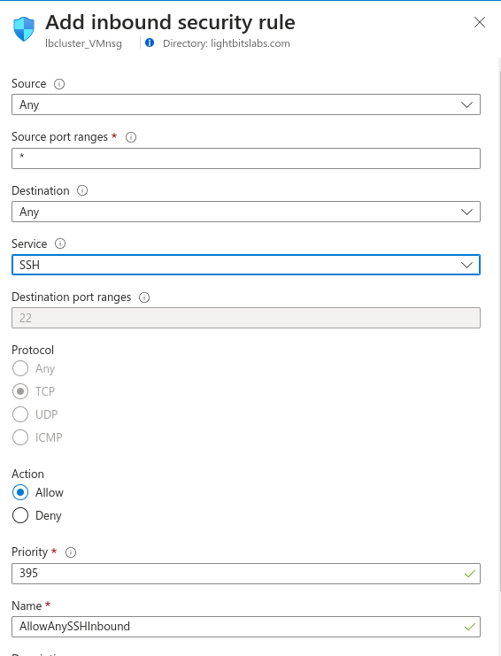 - Click Add and add the SSH rules. You can also limit it for specific origin addresses.