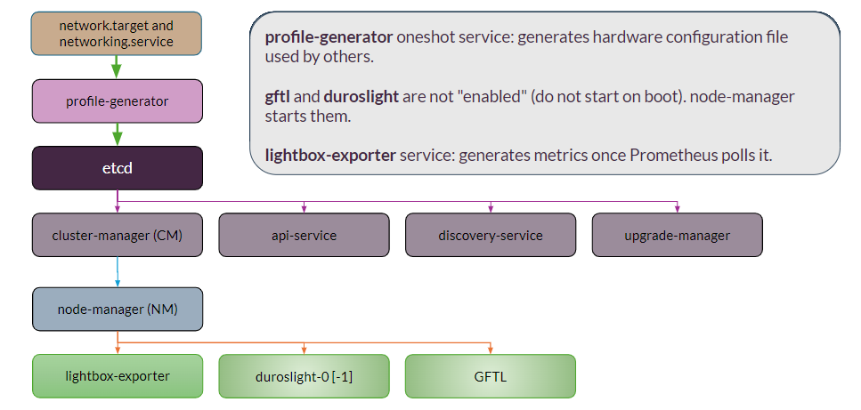 - node-manager (NM): Reads ETCD and configurations generated by profile-generator, to configure and start GFTL and then Duroslight.