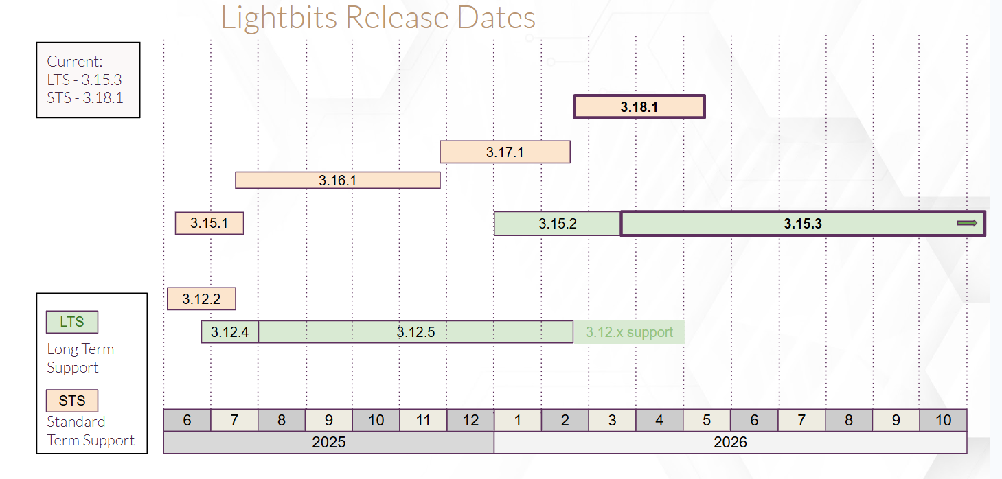 The table below displays the timeline of Lightbits LTS releases.
